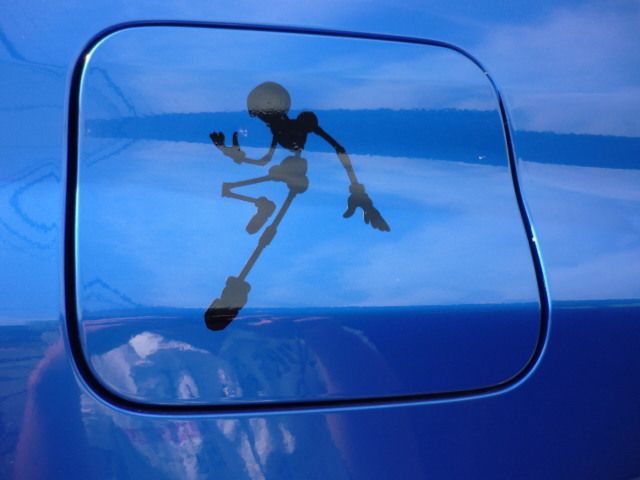 トランク…は先客がいるから…と車の周りを回ってみて丁度良くガソリン蓋がサイズ的にぴったりなので貼りました。